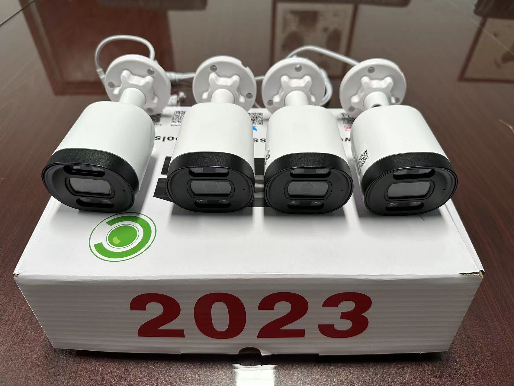 4 Cámaras POE Bullet de 5mp con lente gran angular 2,8mm, IA detección de presencia humana y de vehículos, triger de alarma por audio luz blanca y notificación PUSH, grabación interna en cada cámara incluida.